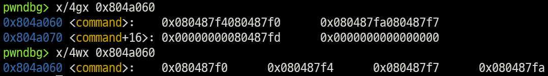 x/4wx 0x804a060 : 0x804a060 에서 부터 32bit 16진수로 4개 읽기