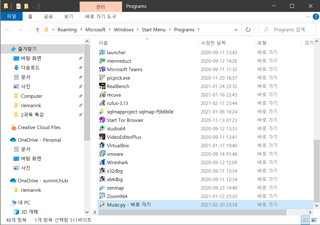 이제 "%appdata%\Microsoft\Windows\Start Menu\Programs"에 Music.py의 바로가기를 추가한다.