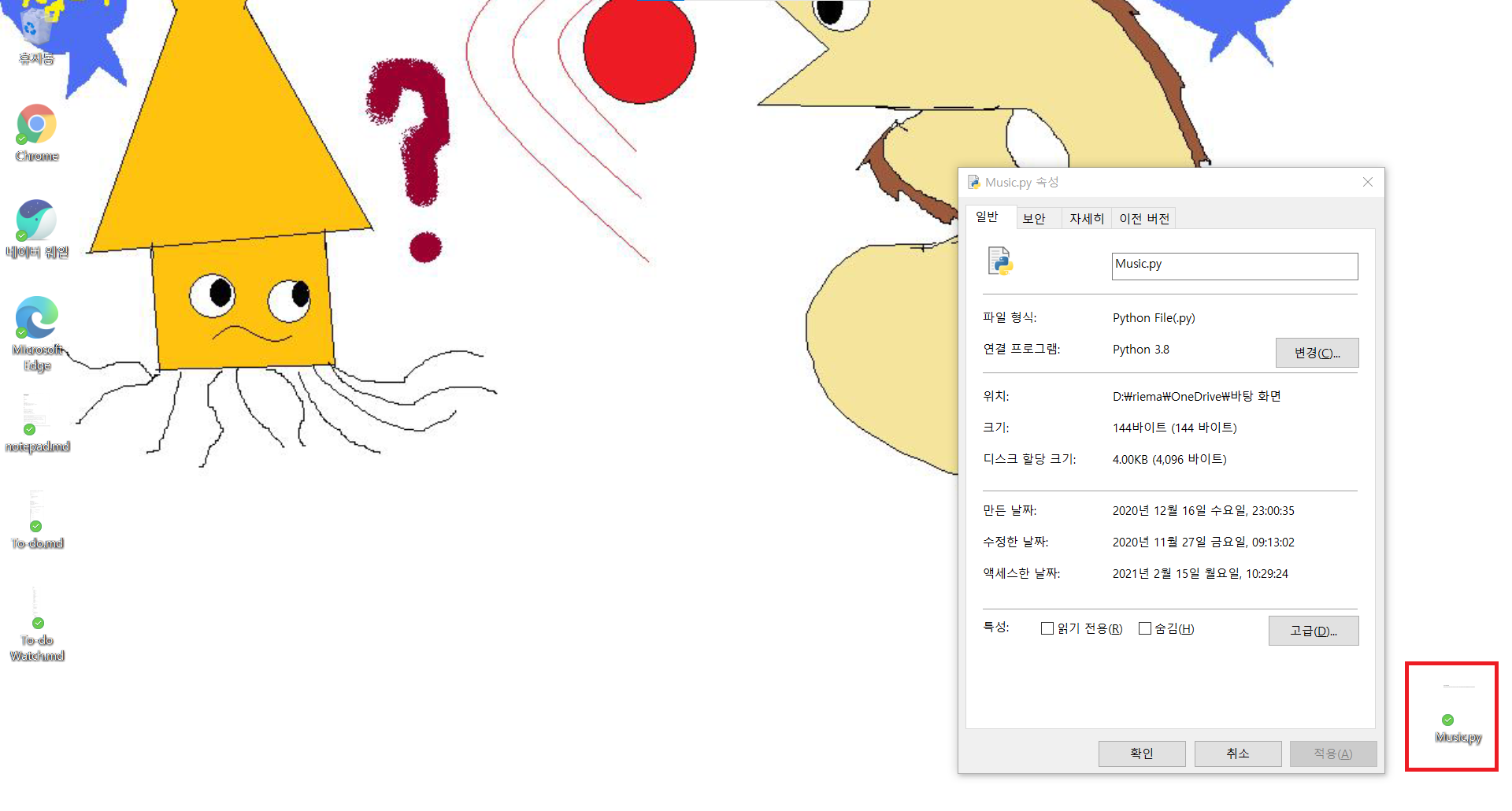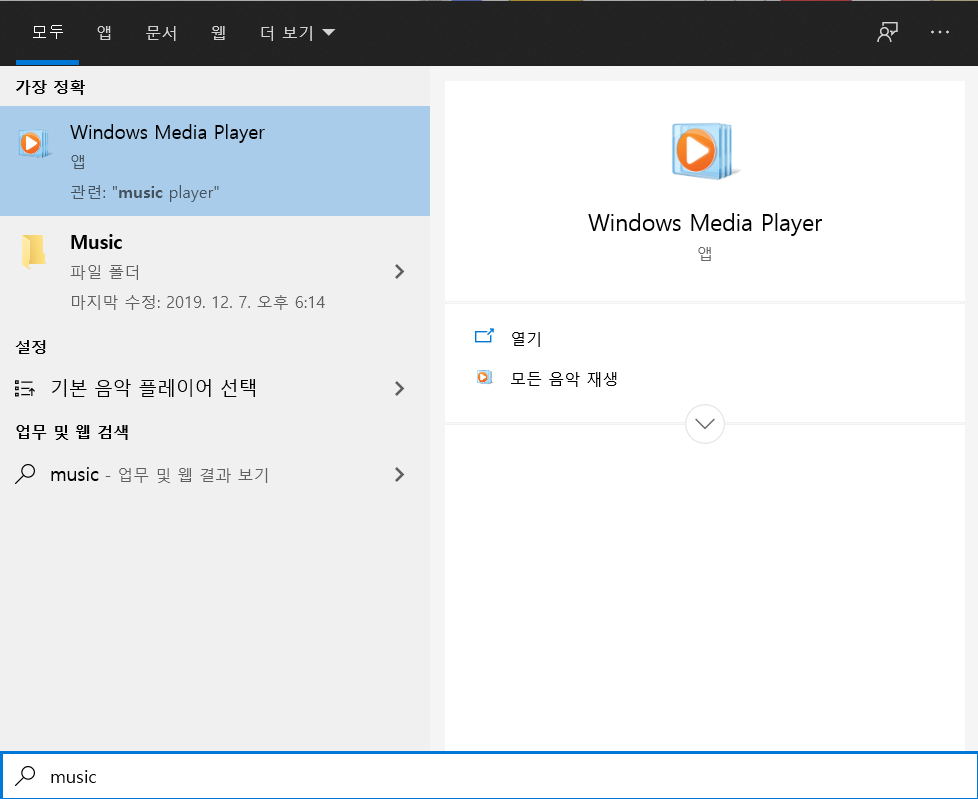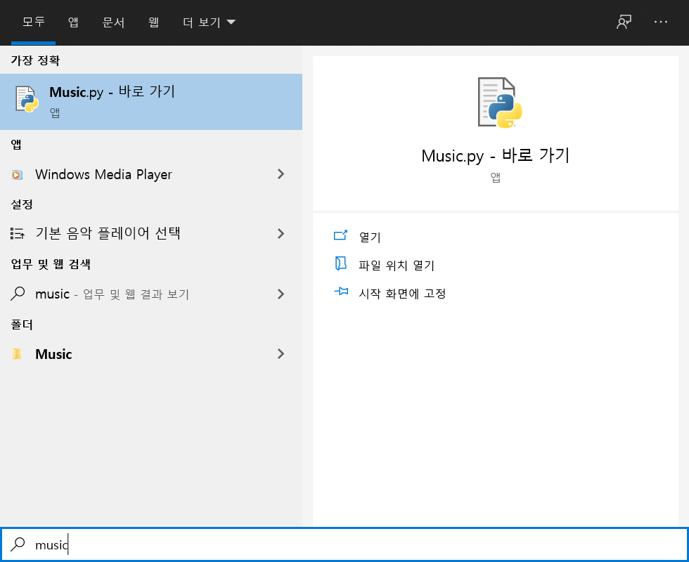 다음과 같이 아까추가한 Music.py - 바로가기가 검색되는것을 확인해 볼 수 있다.